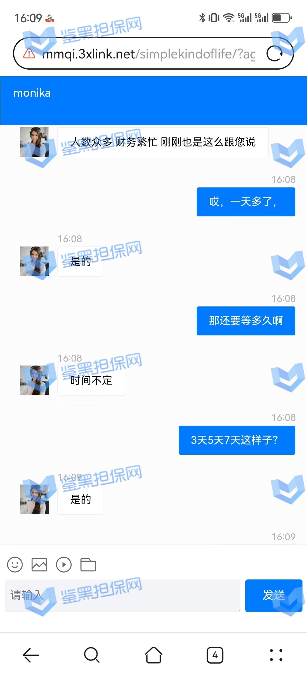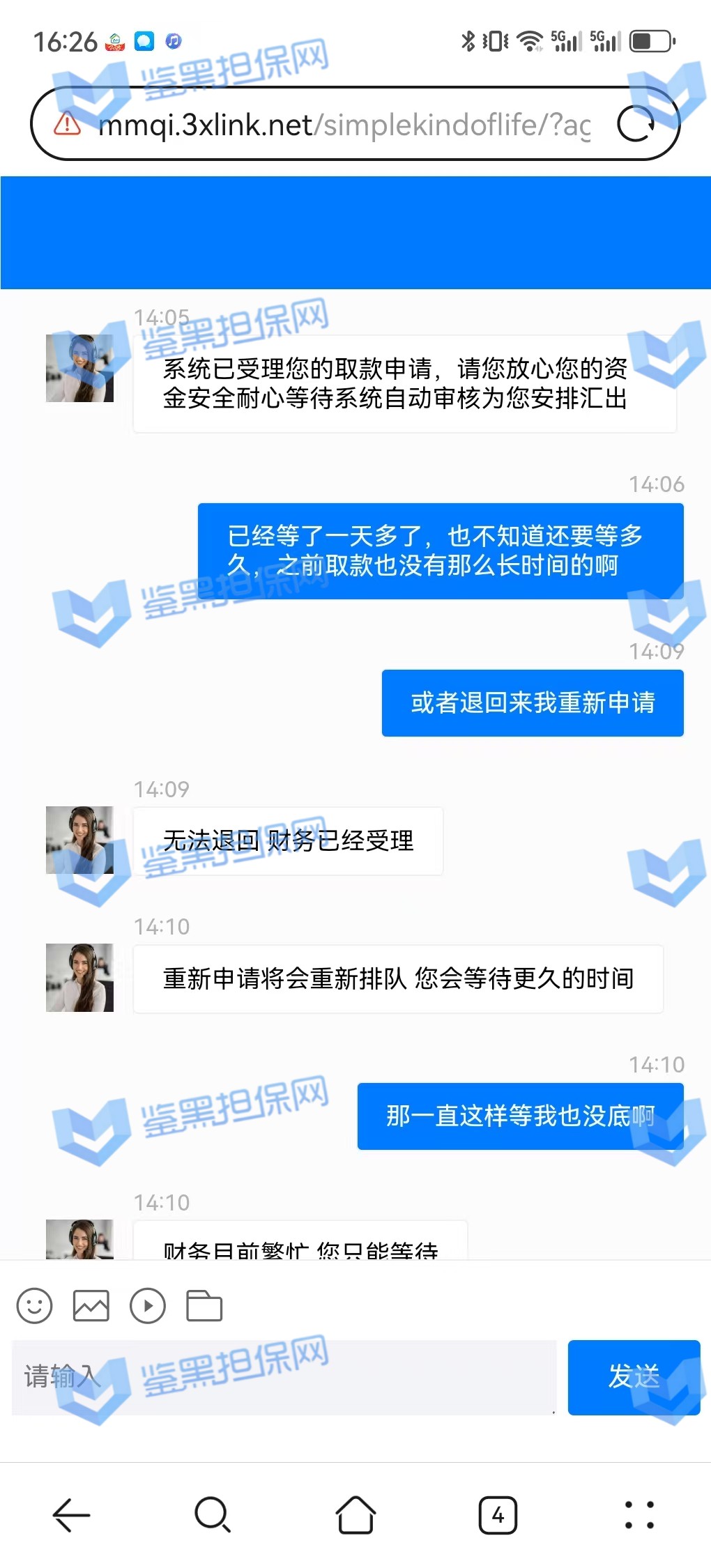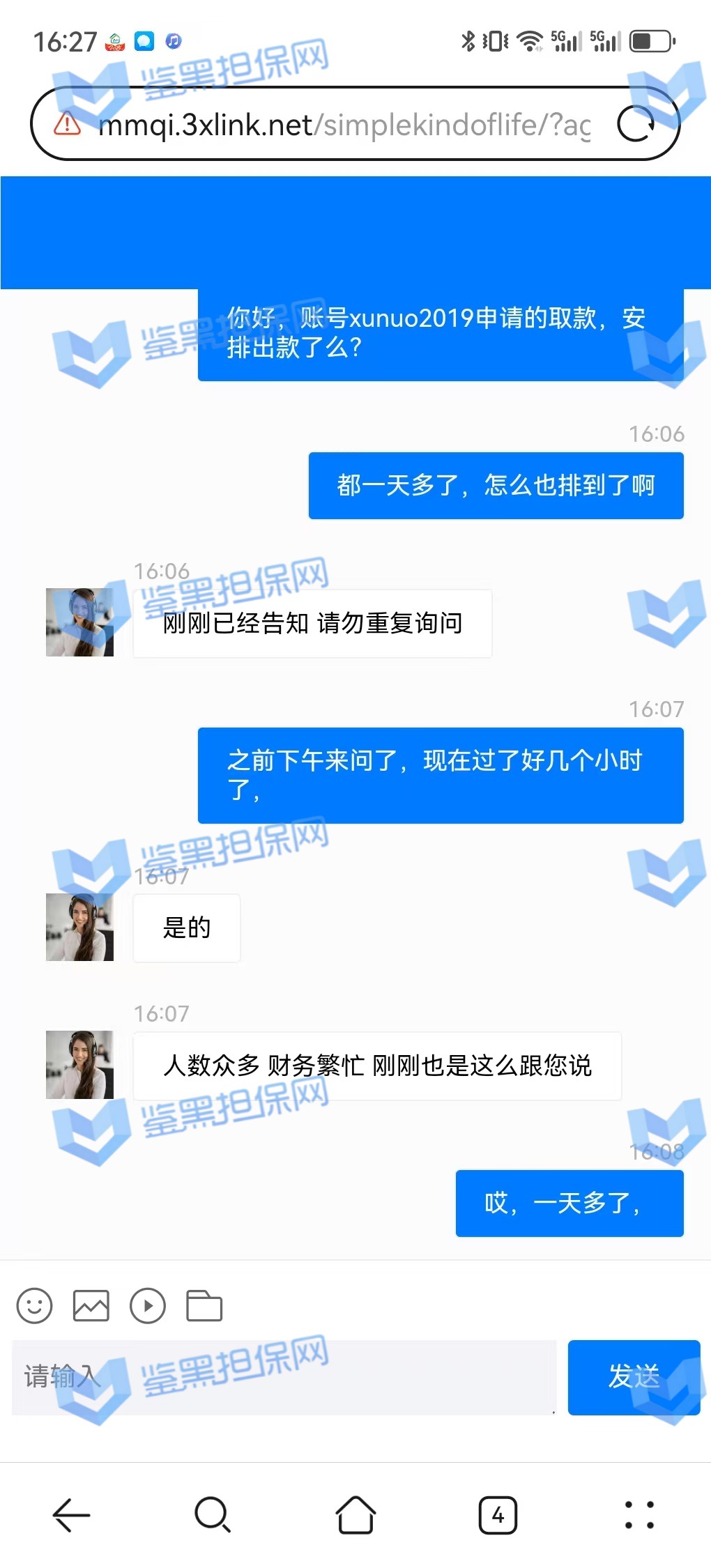 3、鉴黑担保网维权专员联系该平台核实情况,相关负责人表示财务繁忙,出款用户较多,需要依次处理,但是已过去2天时间且网站也没有发布提款繁忙公告通知玩家,维权专员沟通后要求尽快出款,对方表示会尽快处理。