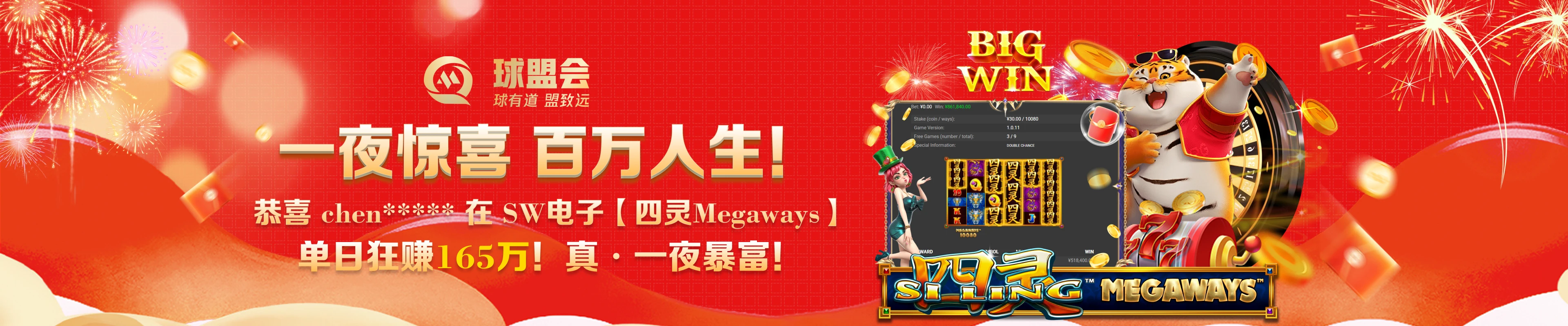 恭喜新会员chen****在SW电子【四灵Megaways】单日狂赚165万!!