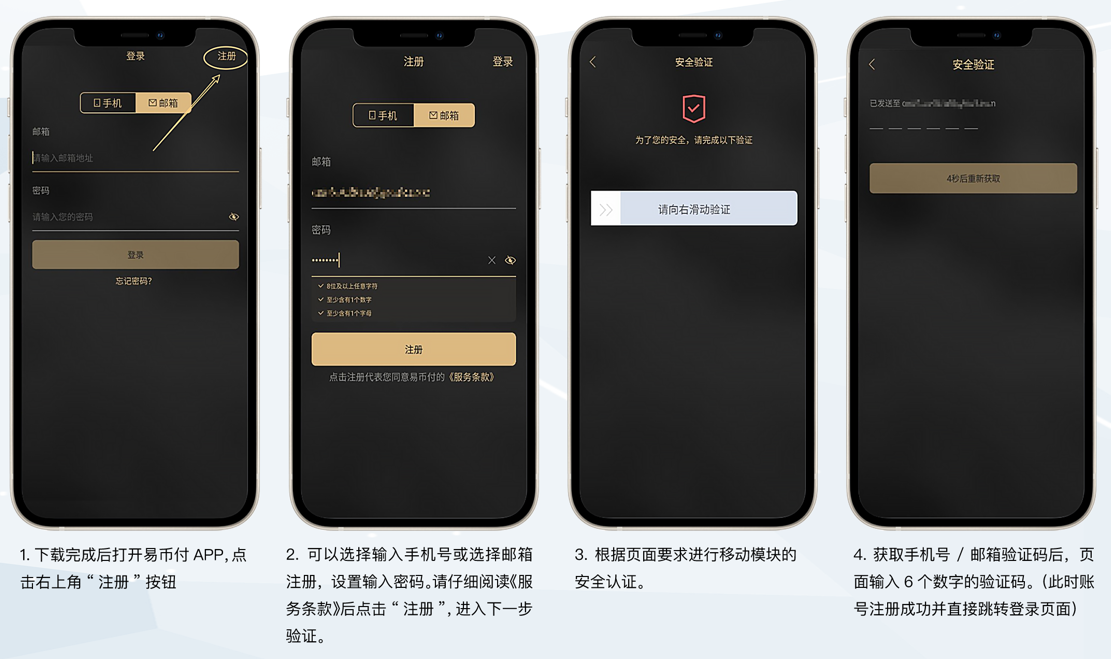 ①下载完成后打开易币付APP,点击右上角“注册”按钮