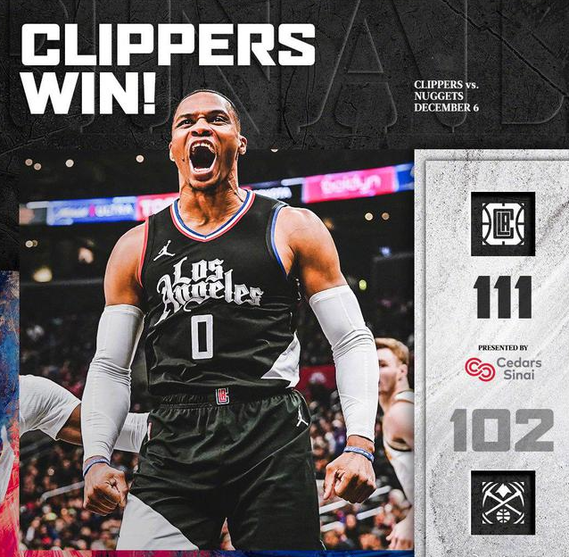 快船队的乔治得到25分和8个篮板,哈登得到20分和11次助攻,小卡得到17分、4个篮板和5次助攻,鲍威尔得到17分和5个篮板,祖巴茨得到10分和9个篮板,威少得到9分和8个篮板。掘金队的穆雷得到23分和6次助攻,约基奇32中9创生涯单场打铁数纪录空砍22分、15个篮板和10次助攻,波特得到18分和9个篮板,杰克逊得到14分。